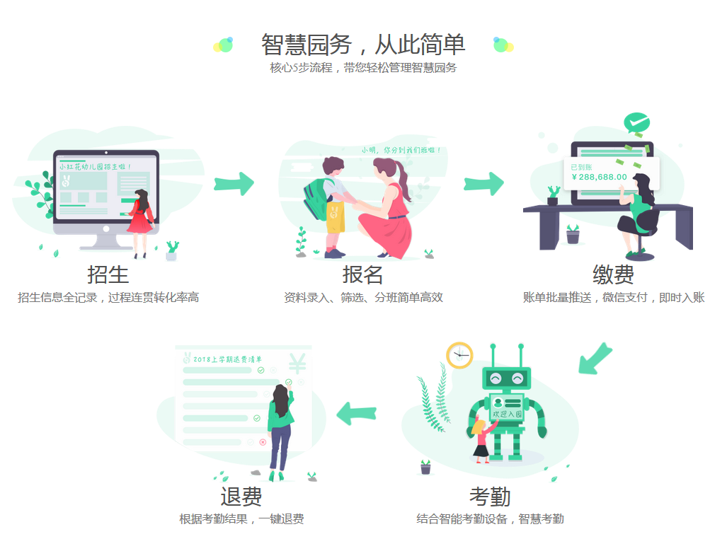 ③ 园务邦为园所打通了最为关键的“招生管理”→“报名管理”→“账单缴费”→“日常考勤”→“财务退费”5个核心流程业务。